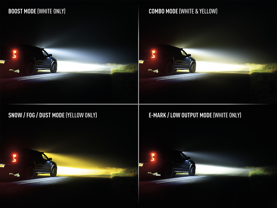 illumination. - Snow/Fog/Dust Mode: Utilises yellow light to enhance performance in challenging