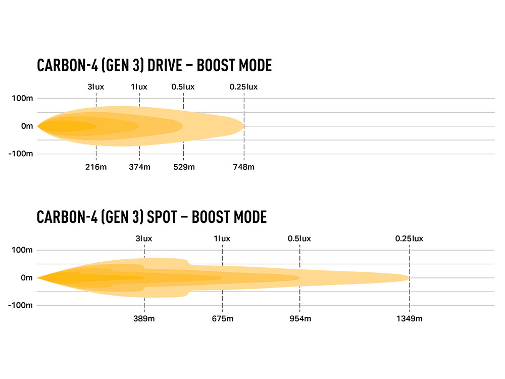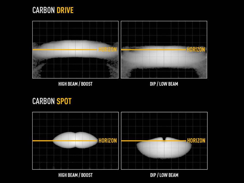 Versatility lies at the heart of the Carbon-2 and Carbon-4's design; with options for both 'Spot' and 'Drive' beam patterns. The ‘Drive’ beam offers a 60-degree spread, ideal for comprehensive road coverage, whereas the 'Spot' beam ensures long-range visibility. The Carbon-4 Spot delivers 1 lux to 675m (per lamp) with a 32-degree spread, while the Carbon-2 Spot delivers 1 lux to 454m. Furthermore, the 'High Beam' mode provides maximum visibility and the 'Dip / Low Beam' mode is designed to mitigate glare in dust, fog, or heavy rain, allowing both models to adapt to perform in any conditions. The Carbon-4 stands out with its 24 premium LEDs, emitting 6,240 raw lumens that can be boosted by 120% with PWM signal application, and the Carbon-2, with 12 LEDs, delivers a robust 3,120 raw lumens.