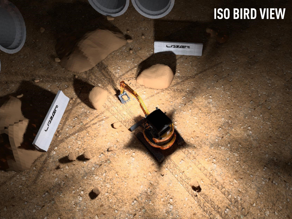 The following simulations visualise the exact light output achieved by the case study set up, demonstrating the combination of front and rear lighting and the distribution of light in the key zones in front off and around the excavator.