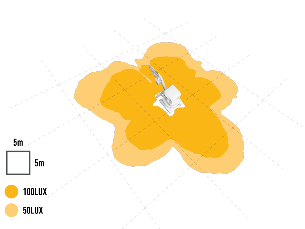 In summary, from the simulation and case study results - we can see this set up is achieving excellent levels of lighting (>100 Lx) in a wide area around the mini digger, with an otpimal level of light uniformity across all required zones. The light output is crucal but we can also see the strategic positioning of theese lamps is also key to to optimise coverage and uniformity for the operator. This result is achieved using 7 lamps in total, comprising x4 Utility-25 MAXX and ×3 Utility-25 lamps.