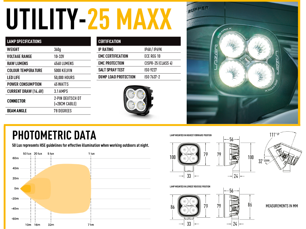 At Lazer we are proud that our Utility Series of work light solutions are trusted across the world in key industrial sectors such as construction, agriculture, mining, and forestry. As a UK brand with all our design, engineering, and manufacturing done in-house, our lights are built to the highest standards. The result is solutions that not only deliver incredible lighting performance and durability, but improve safety, visibility, and efficiency in critical scenarios.