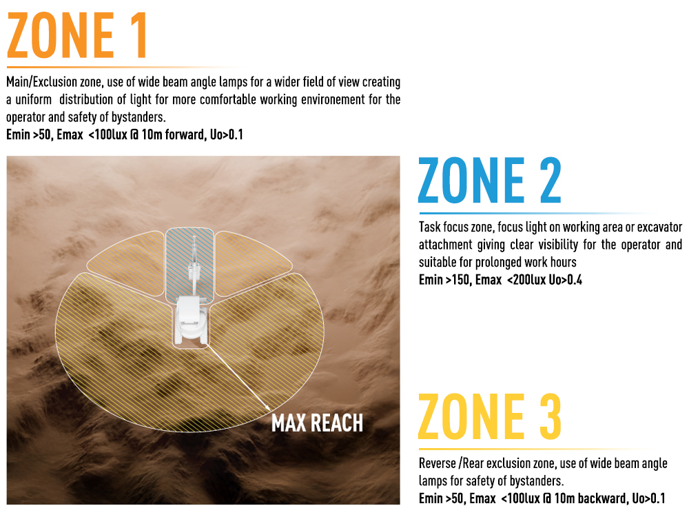 Recognising the European standard: EN12464-2, which defines minimum safe illumination of between 20lux-200lux for outdoor excavator work, we have carefully designed the following lighting setup, which is based on achieving the best spread of light taking into account the key zoning parameters and the optimal illuminance within them. Ensuring the side and rear of the machine have clear visability is also Essential for maintaining a safe working area, our rear set up follows HSE HSG38 guidelines - which define the range of illuminance around the vehicle between 50lux-100lux.