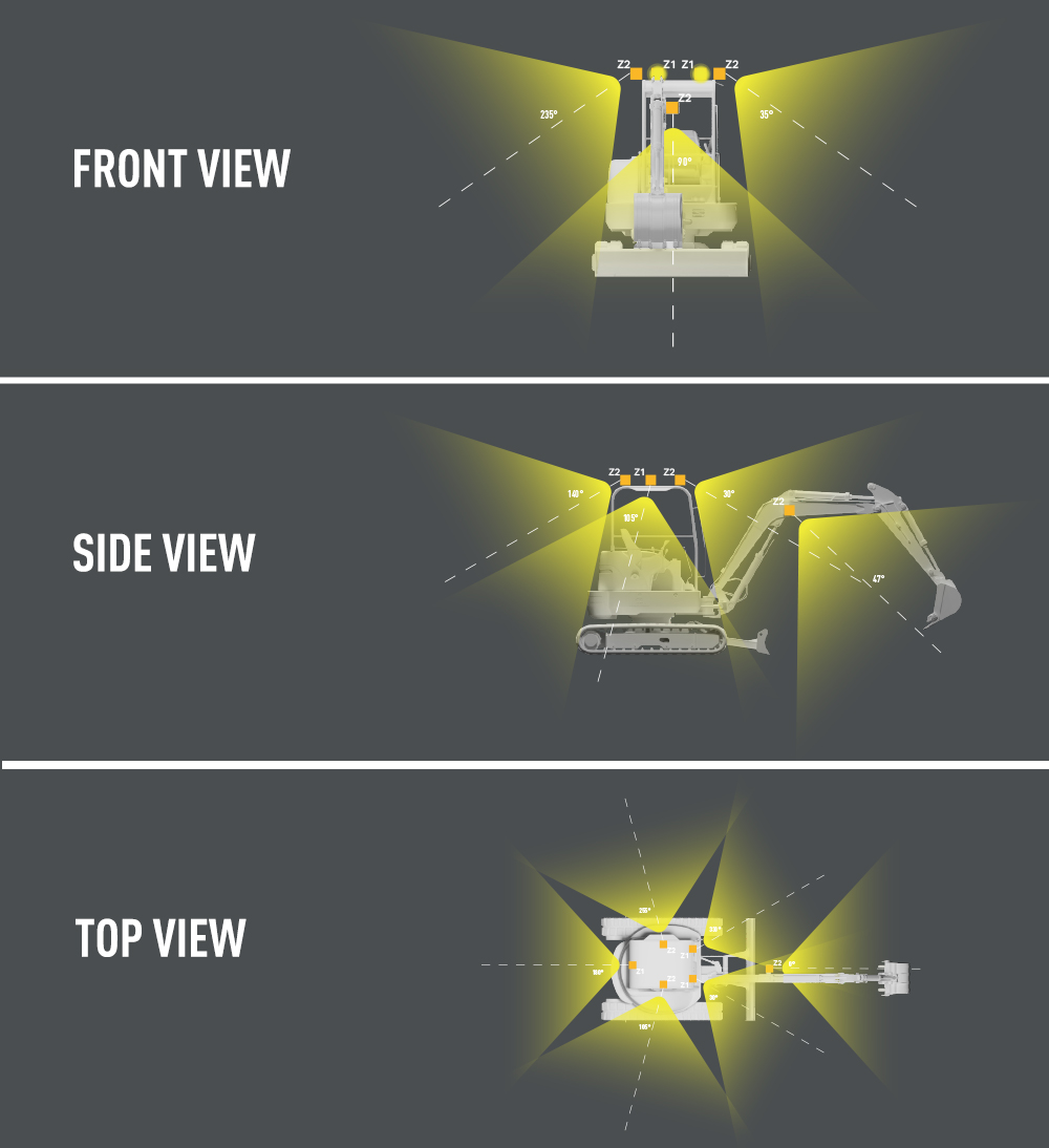 At Lazer, we leverage our expertise and advanced lighting analysis tools to work within the defined lighting zones. This enables us to recommend the ideal lamp selection, vehicle positioning, tilt angles, and beam configurations, ensuring optimal and performance. When deciding which zones to illuminate and to what extent, the operator should consider both the areas where tasks will be performed and those required for the safe movement of pedestrians or other workers. For mini diggers we have indetified the following 3 key zones: